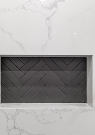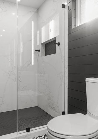 This bathroom remodel combines bold shiplap, warm wood tones, and striking black-and-white tile to create a space that’s both dramatic and inviting. Luxurious quartz slabs in the shower elevate the design, resulting in a stylish, functional, and enduring bathroom that makes a statement while staying timeless.